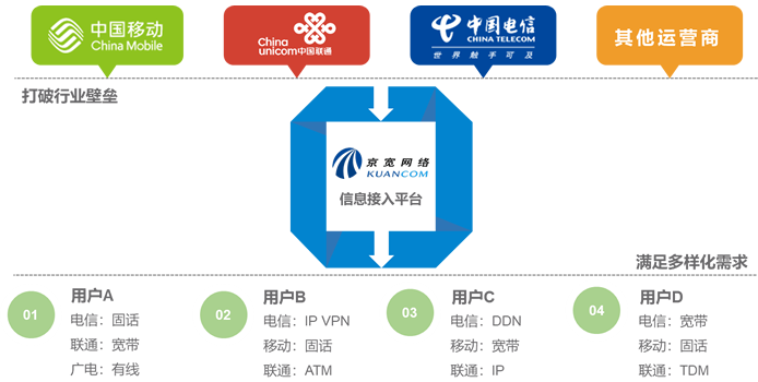 優狐網絡自(zì)主研發的(de)公共信息網₹☆絡接入平台,通(tōng)過整合中國(guó)移動、中國(guó)聯通∏γ(tōng)、中國(guó)電(diàn)信等多(duō)家(jiā)基礎✔↔電(diàn)信運營商的(de)業(yè)務資源,使客戶僅通(tō÷♦©ng)過一(yī)個(gè)平台就(jiù)能(néng)™'☆獲取最全面的(de)基礎電(diàn)信業(yè)務項目,并在平台上(≥©"shàng)有(yǒu)效實現(xiàn)需求,解決↑♣>客戶因業(yè)務分(fēn)散而帶來(lái)的(dα$e)諸多(duō)不(bù)便。